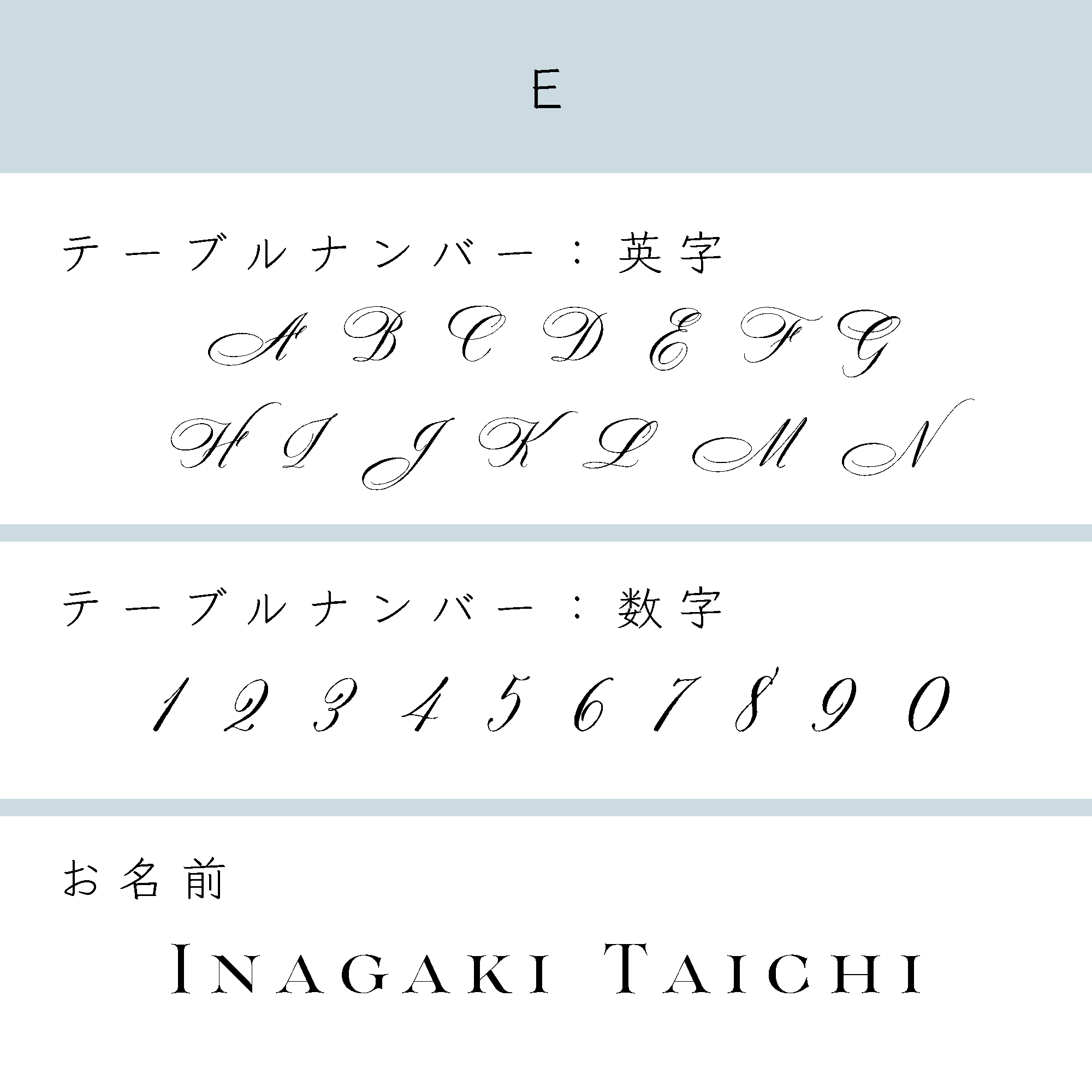 また、席札やテーブルナンバーとセットでご購入を検討される場合は、無料でそれぞれフォントをそろえることも可能です。どうぞご購入前にお気軽にご相談ください。
